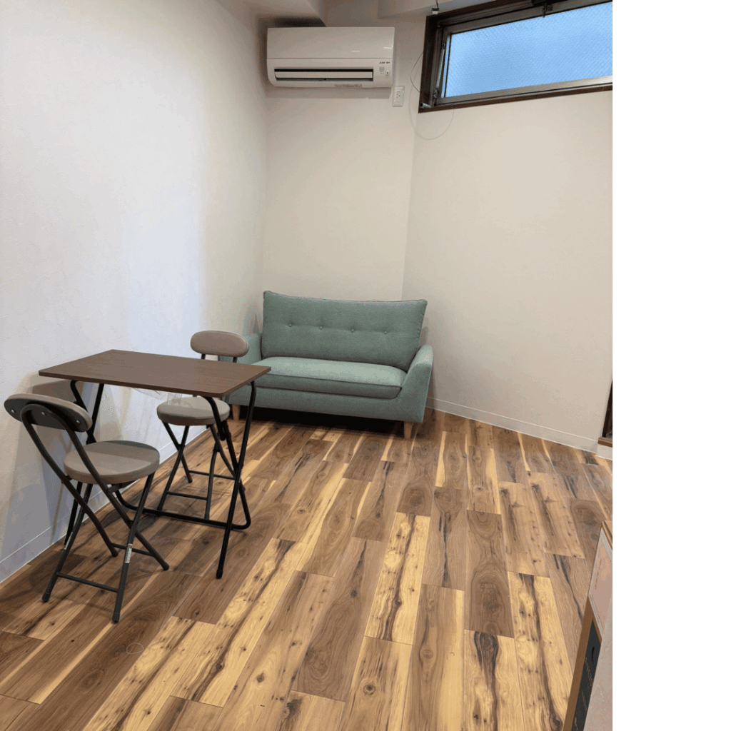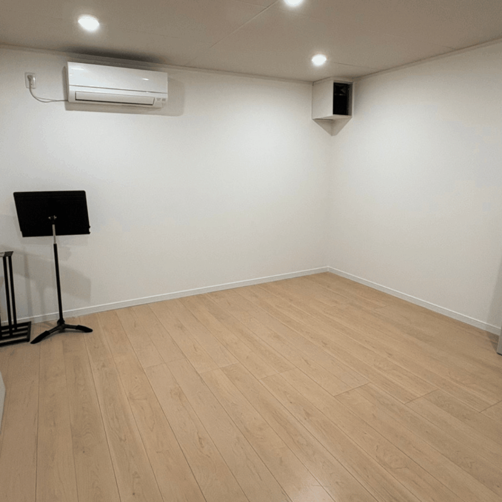 アップライトピアノ、長机2、椅子5、譜面台5、